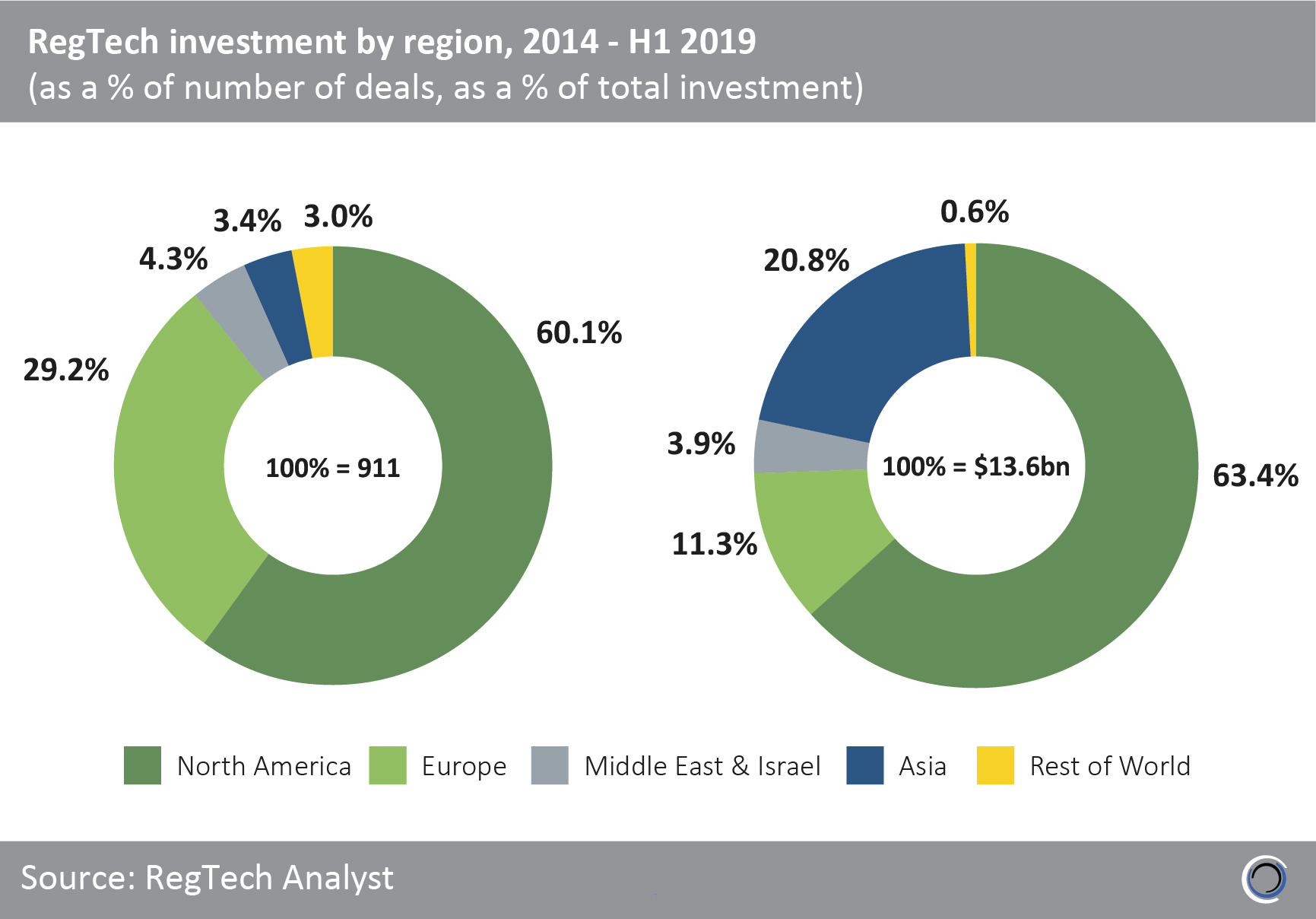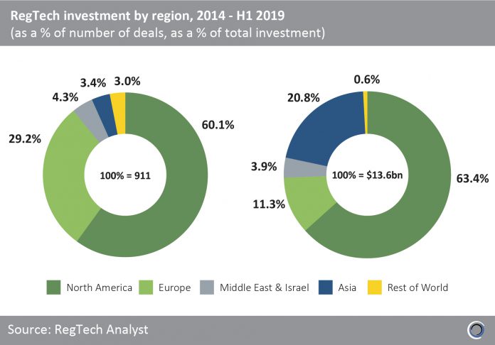 RegTech companies in North America have captured 63.4% of the $13.6bn that has been invested in the subsector since 2014, which is proportional to the region’s share of deal activity.