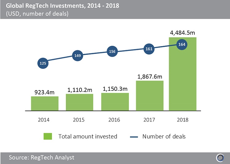 Global RegTech investment grew almost five-fold between 2014 and 2018. An increase of 48.5% CAGR, in terms of capital invested, has seen funding grow from $923.4m in 2014 to $4,484.5m in 2018.