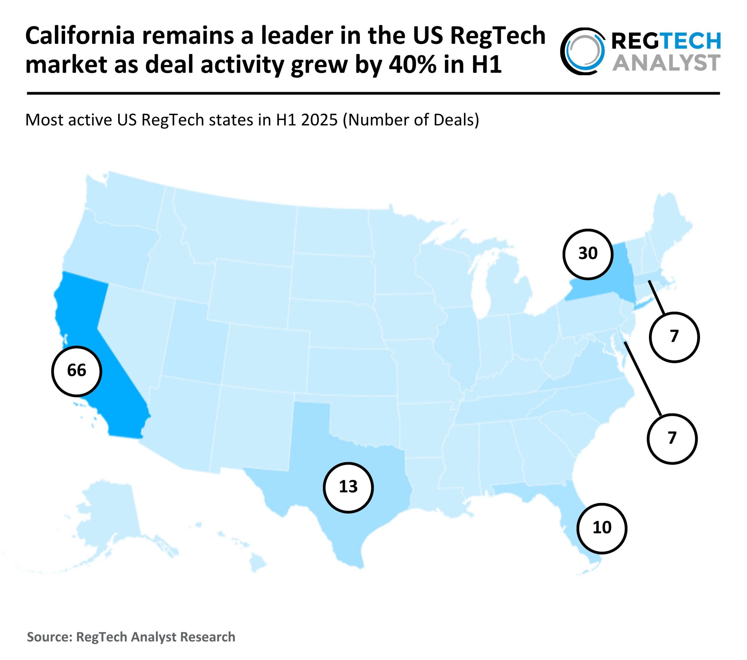 California remained the dominant hub for RegTech activity, leading with 66 deals in H1 2025, representing a 37% share — a notable rise from the 49 deals (28% share) recorded in H1 2024.
