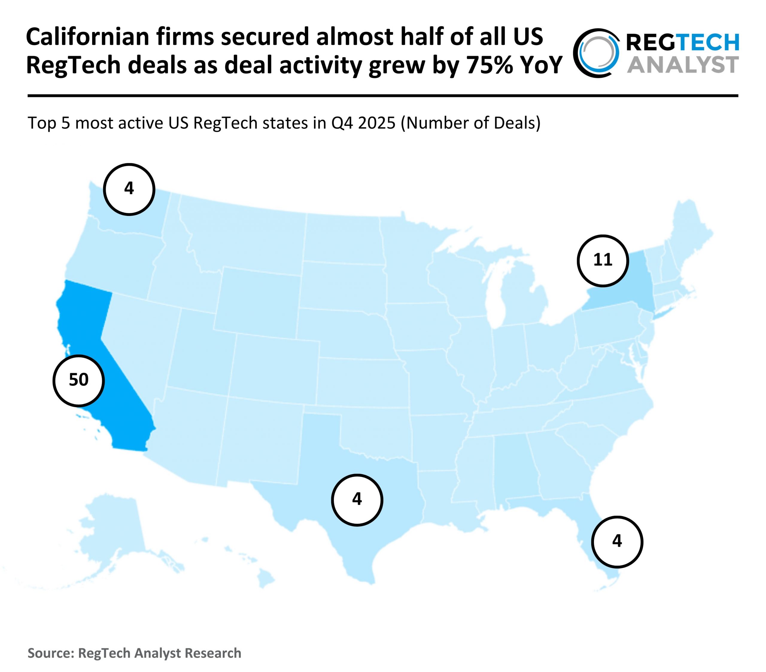 California remained the most active RegTech market in Q4 2025 with 50 deals (48% share), a 2.8x increase from 18 deals (30% share) in Q4 2024.