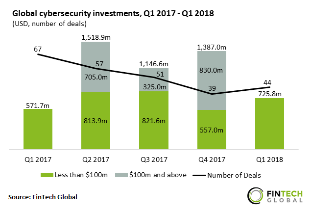 - Total investment in Q1 2018 reached just $725.8m, a fall of 47.7% from the previous quarter. However, compared to the same quarter in 2017, total funding increased by 27%.