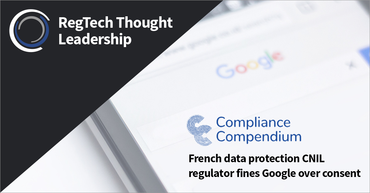 The internet giant is allegedly being charged with a lack of transparency, information and effective consent around data, several media outlets claim. Compliance Compendium chief business development officer Gareth Gadd looks into the reasons of why the CNIL is spearheading this fine.
