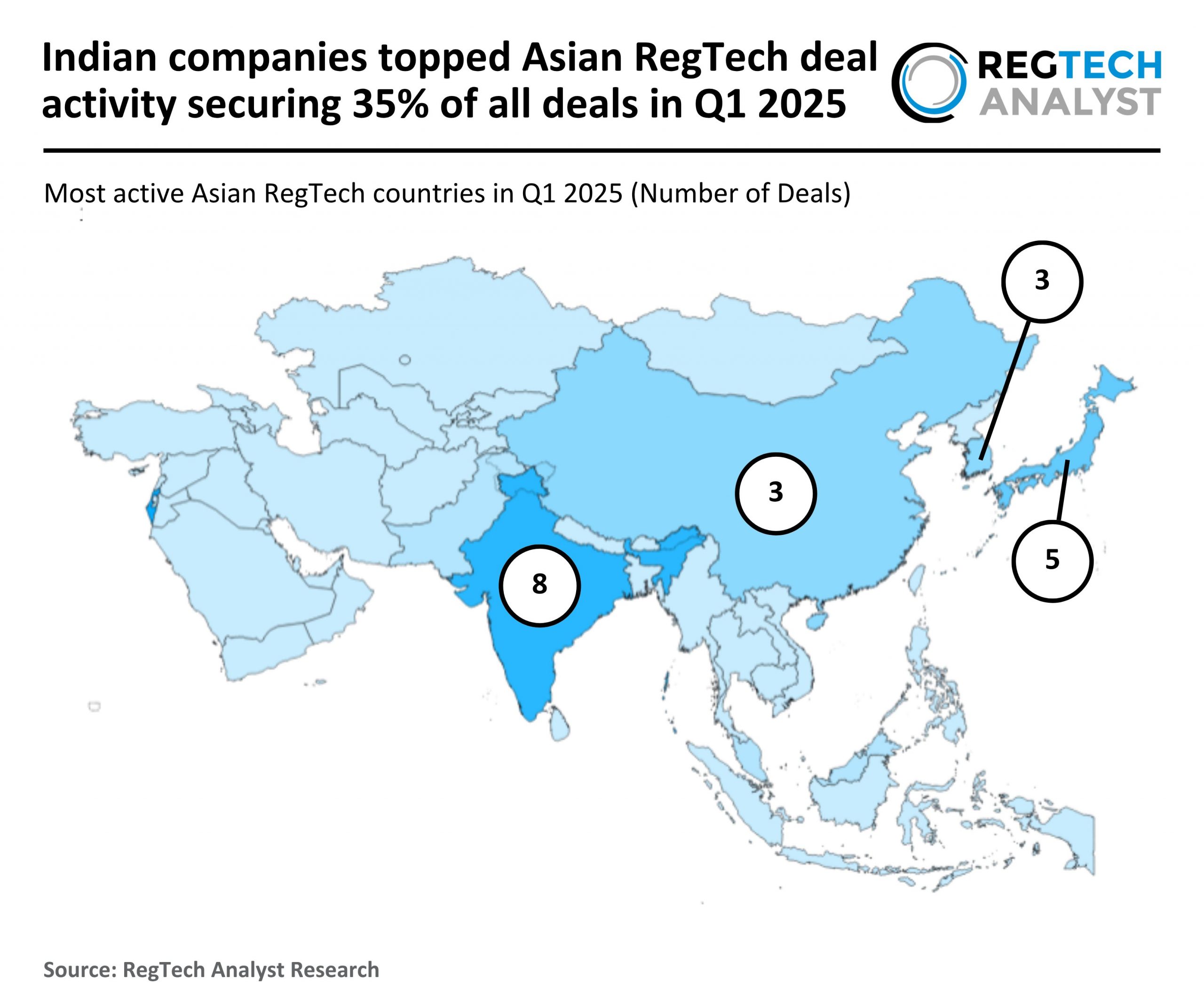 India emerged as the most active RegTech market in Asia during Q1 2025, completing eight deals (35% share), up from nine deals (24% share) in Q1 2024.