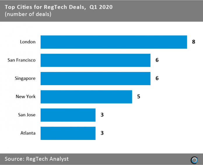 The top six list was rounded off by San Jose and Atlanta, which saw three RegTech deals each completed in the cities.