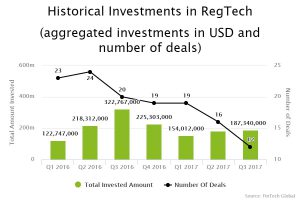 In the first three quarters of the year, more than $523m has been invested across the global RegTech industry according the data by FinTech Global. E-commerce fraud protection provider Signifyd has scored the biggest deal of the year to date, nabbing $56m in a Series C funding round in May. With the final quarter of the year to go, 2017 could match the record high of 2016, which saw a total of $888.7m invested across 86 RegTech deals.