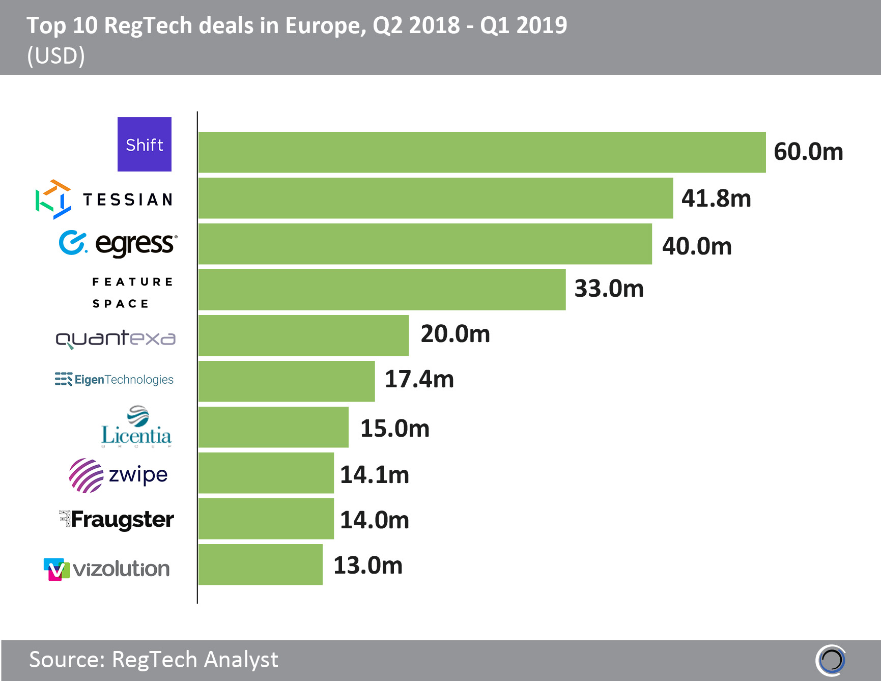 Tessian, a London-based email security solution provider, raised a $41.8m Series B round also in Q1 2019 to accelerate its global expansion. This investment came from Sequoia Capital, LocalGlobe, Balderton Capital and Accel and was the largest UK RegTech deal last quarter.