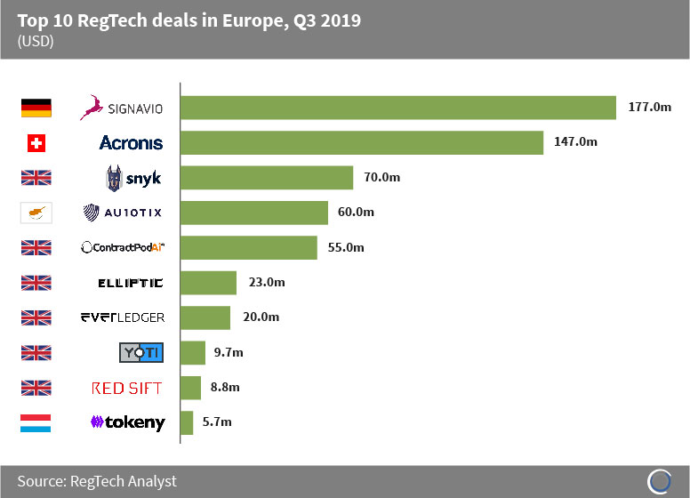 Business process automation, risk and compliance solutions provider Signavio, raised $177m in a Series C round led by Apax Digital in July 2019. This was the largest RegTech deal in Europe last quarter and values the Berlin-based company at $400m.