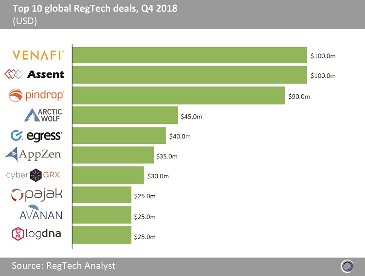 The top 10 global RegTech deals in Q4 2018 raised $515m, which is equal to 70.4% of the total capital raised in the quarter.