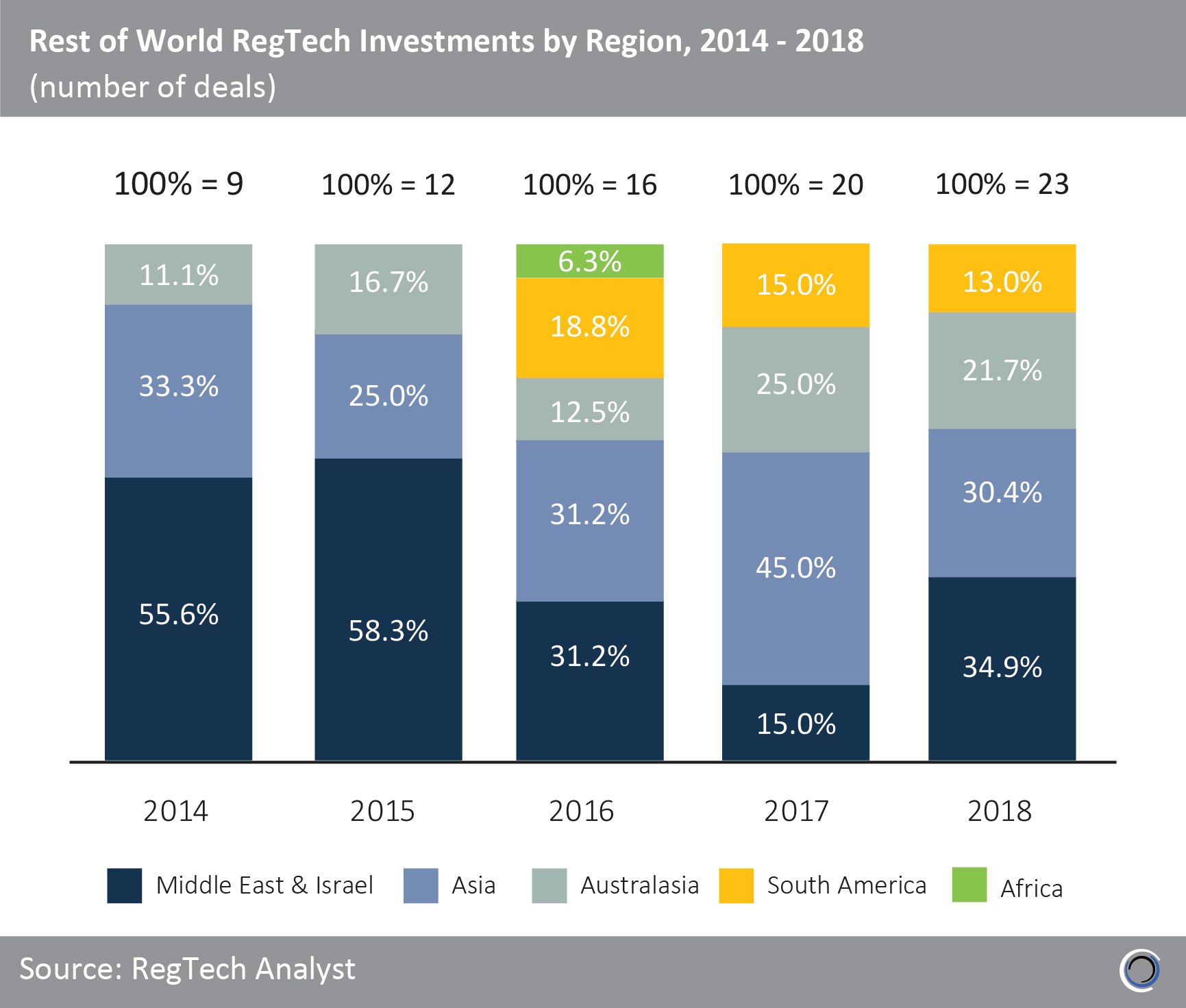 In 2014 and 2015, companies in the Middle East & Israel were involved in almost 60% of RegTech investments in the rest of the world. The sub-region’s control of the sector has shrunk dramatically over the years, as deals have been more evenly distributed among other regions since 2016.