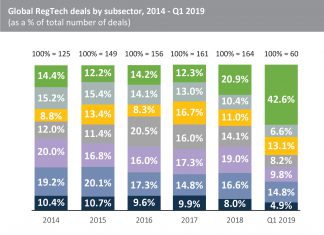 RegTech companies in South America have been raising capital since 2016, claiming 18.8% of deals that year, 15.0% in 2017 and 13.0% of transactions in 2018. Ceptinel, a Chilean risk management solution provider based in Santiago, raised $1m of venture funding from HCS Capital Partners in Q2 2018.