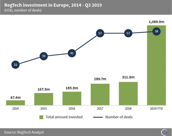 More than $2.1bn has been invested in RegTech companies in Europe, across 284 deals, with more than half of this capital raised in the first three quarters of 2019 alone.