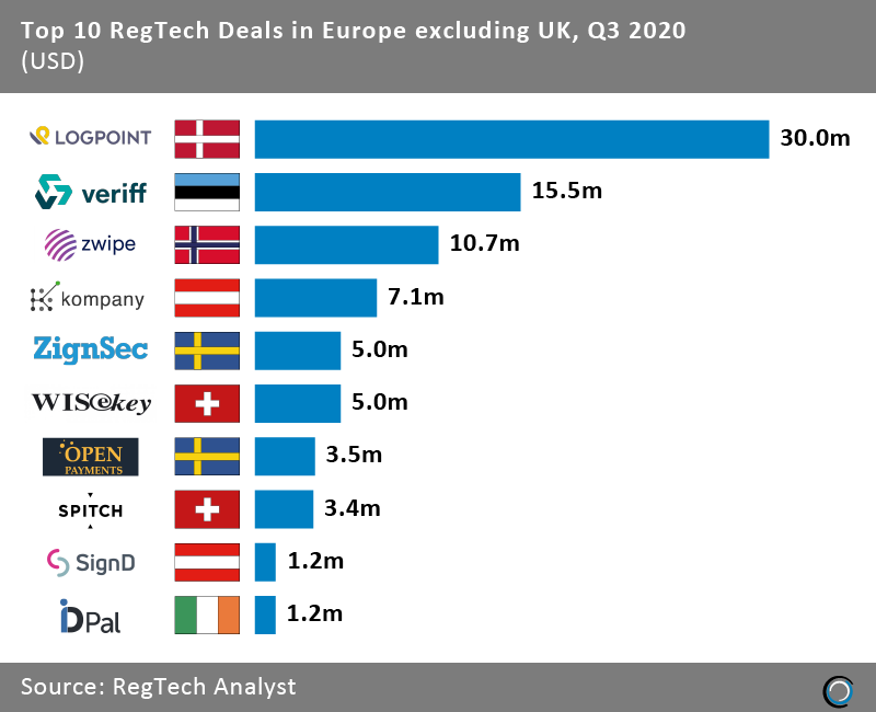 If we dive deeper into the RegTech activity in Europe outside of the UK we can see thriving local RegTech ecosystems with seven countries represented in the list of top deals in the region in Q3 2020.