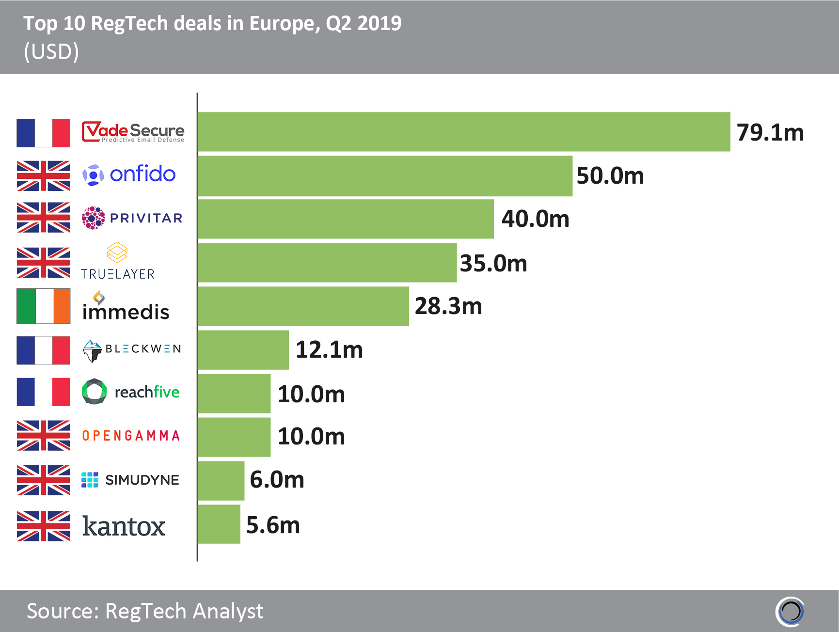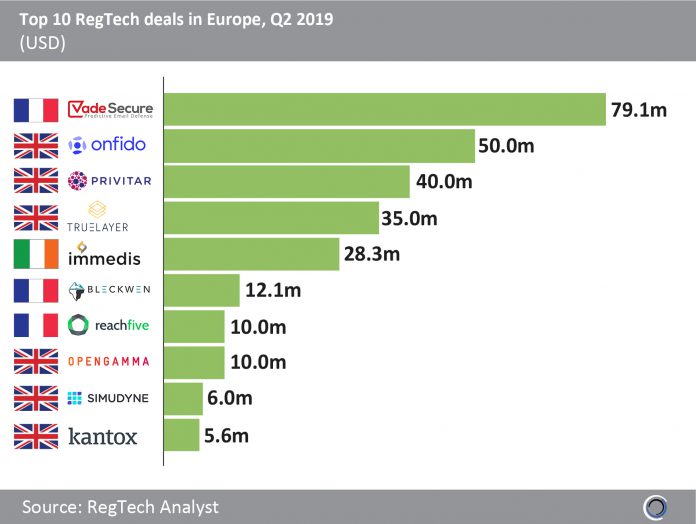 RegTech companies in Europe raised almost $305m across 26 deals in Q2 2019, with $276.1m of this invested in the ten largest transactions last quarter.