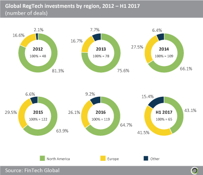 There has been a significant shift in the centre of gravity of global RegTech investments since 2012. Although the number of deals in North America continues to increase, the region has seen its share of the total drop by almost half, from 81.3% in 2012 to 43.1% in H1 2017.