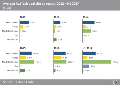 The impact of a small number of larger deals on the average of a small sample size also explains the variations in average deal size for Asia, where the $6.1m Perfios Software Solutions was the only significant deal in H1 2017.