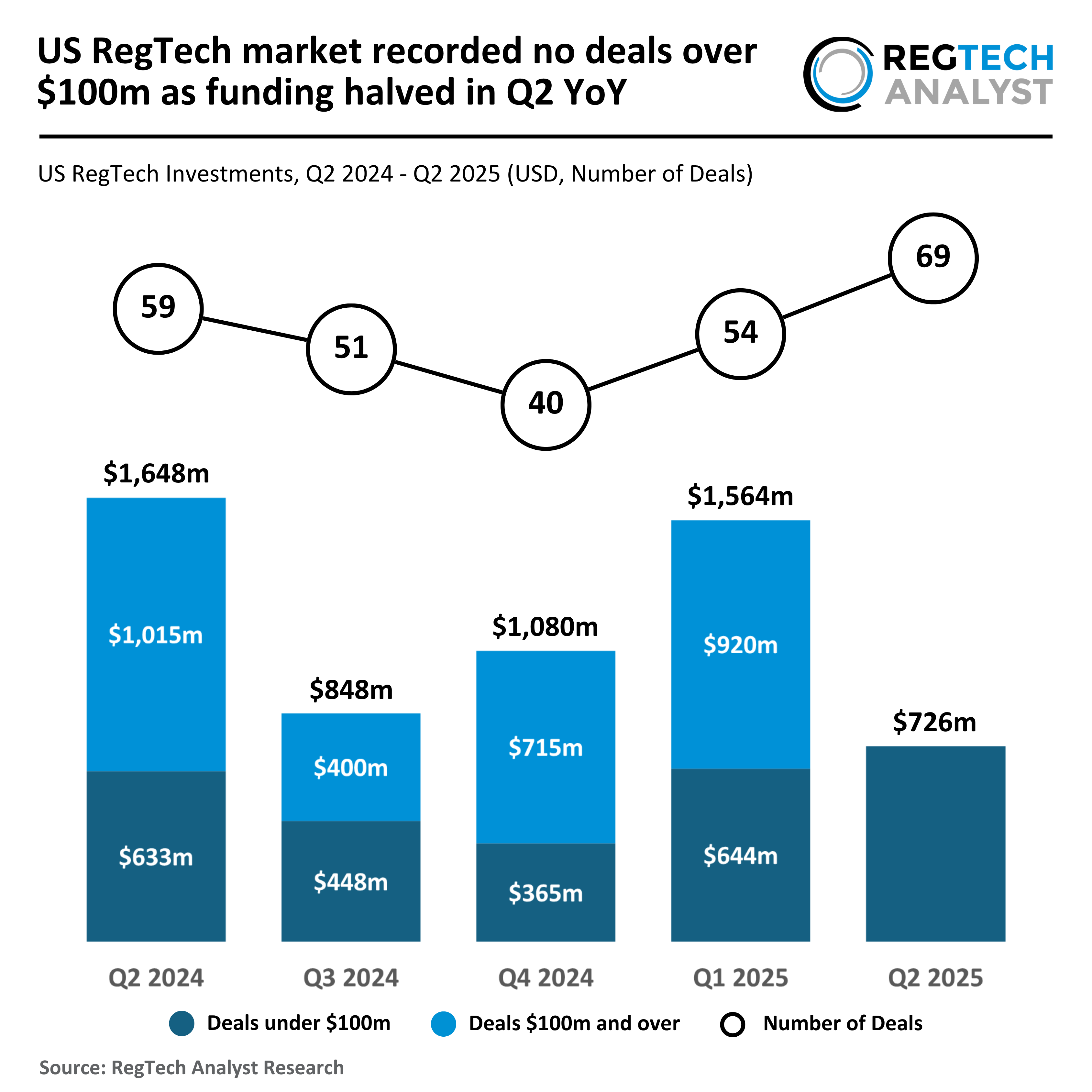 In Q2 2025, the US RegTech market recorded 69 deals, representing a 17% increase from the 59 deals seen in Q2 2024 and a 28% rise from the 54 deals completed in Q1 2025.